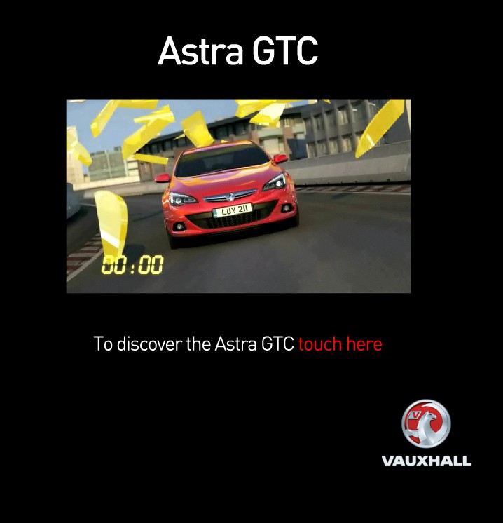 Приложение предназначено для презентации нового автомобиля Astra GTC. Приложение было создано для работы через тач-скрин терминалы, быстро и легко ознакамливает потенциальных клиентов с новой моделью автомобиля Vauxhall, а также предоставляет возможность подписаться на рассылку новостей компании. Вводимая клиентом через терминал информация хранится для дальнейшей обработки.