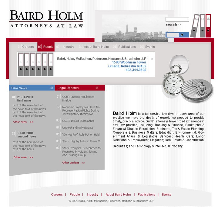 Редизайн веб-сайта крупной американской адвокатской компании. Адвокатское бюро было создано с целью расширения деятельности партнерства и оказания максимального спектра юридических услуг для физических и юридических лиц. Сдержанный и серьёзный дизайн подчёркивает солидность данной организации. Адаптированная под нужды заказчика система управления контентом, сложное дизайн-решение.