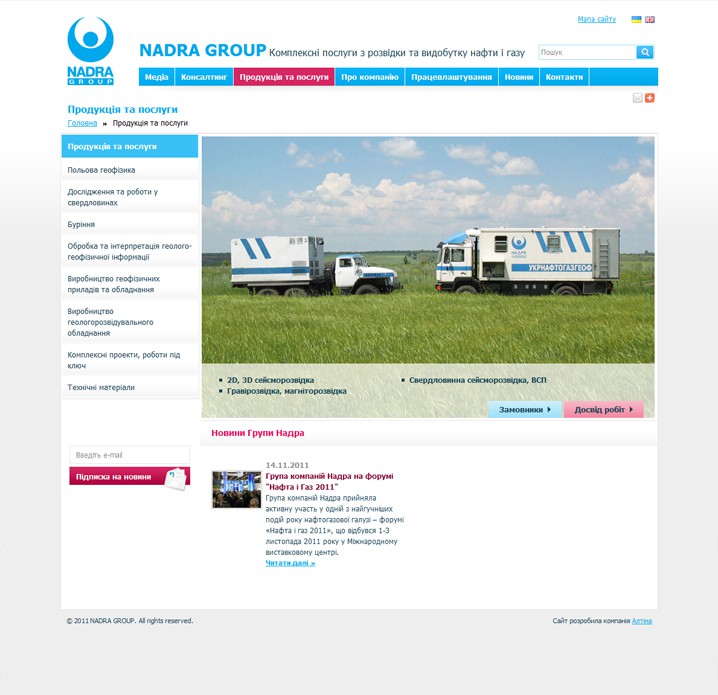 Наш клиент, Группа компаний Надра, является лидирующей украинской компанией, предоставляющая широкий спектр услуг в области разведки месторождений полезных ископаемых, а также производит оборудование для этих целей. «Надра» работает как с отечественными добывающими и геологоразведочными компаниям, так и с клиентами в странах Ближнего Востока, Северной Африки, Российской Федерации и в других регионах.