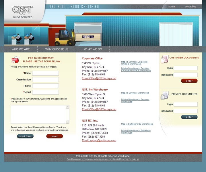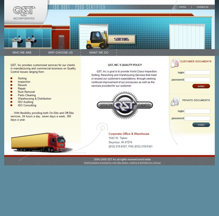 Разработка дизайн-решения сайта для компании QST, занимающейся перевозками и хранением грузов. QST обладает огромным опытом работы в транспортной сфере и имеет множество точек по всей Америке. Основные требования заказчика к будущему проекту - простая система поиска товара или услуг, интуитивно понятный для пользователя интерфейс. Также в наши задачи входило разработать оригинальный дизайн, отображающий суть компании. Использование flash-элементов на "шапке" помогает посетителю понять специфику работы организации. Приятное цветовое решение, удобное меню пользователя, оригинальность и простота дизайна - всё это основные характерные черты удачно работающего сайта компании QST.